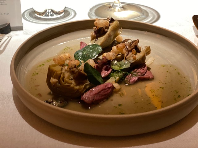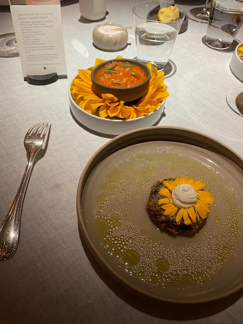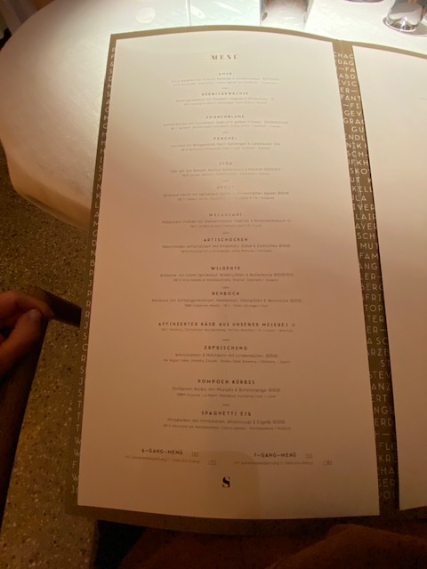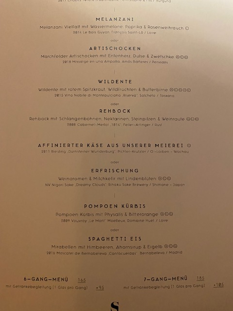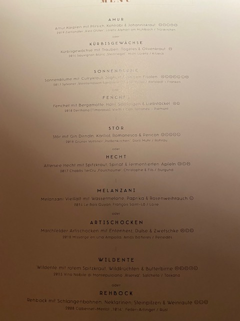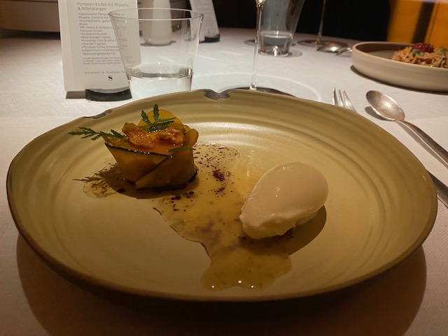 A real highlight of our stay was dinner at Steirereck in the Stadtpark. I had first visited back in 2009, and our return in 2021 proved just as memorable. Ranked among the world’s finest restaurants, Steirereck delivered a seven-course menu full of theatrical presentation and inventive dishes. We enjoyed creations such as Amur carp, sunflower with curry plant, Altersee pike, artichokes, venison, cheeses and imaginative desserts—Danny opted for spaghetti ice cream while I chose a pumpkin-inspired Pompoen. The experience was made even more special by the restaurant’s service rituals: carts rolled up for bread, cheese, tea and sparkling wine, adding ceremony and playfulness to the evening. It was a meal that managed to be both refined and entertaining.