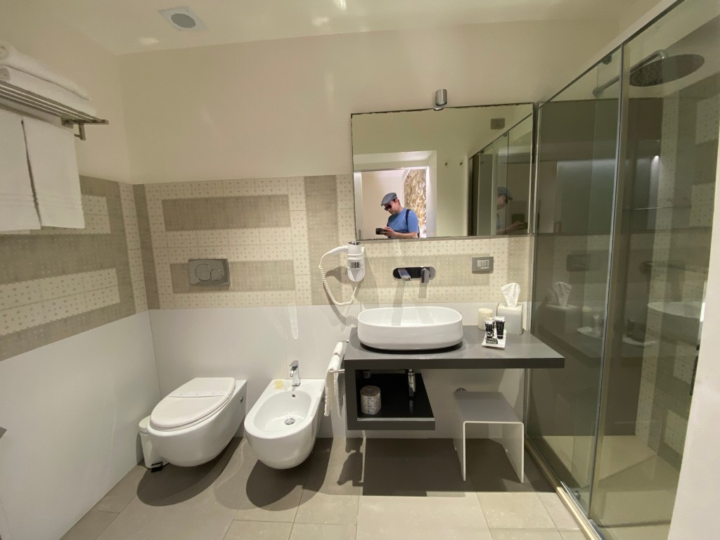 The bathroom has a toilet and a bidet, a single sink and a good size walk-in shower. The shower door closes well so you don’t flood the bathroom and you can choose between a ceiling mounted rainforest shower and a handheld one.