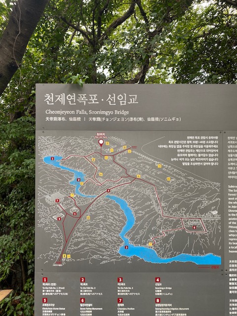 Nearby is Seonim Bridge, a red and white arched pedestrian bridge that spans the Cheonjeyeon Valley. Completed in 1984, this bridge is known for its intricate design featuring carvings of the seven nymphs, linking it closely to the waterfall’s mythology.