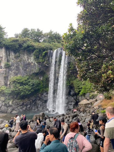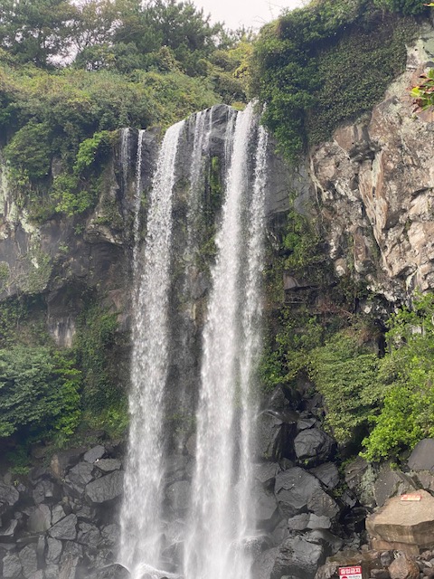 Jeongbang Waterfall (정방폭포), located near Seogwipo on Jeju Island’s southern coast, is a famous natural site and one of the only waterfalls in Asia that flows directly into the sea.