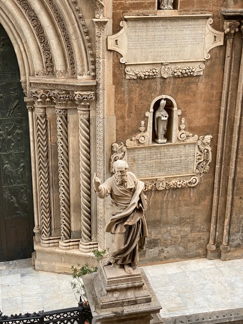 The intricately carved portal was executed between 1426 and 1430 by Antonio Gambara, while the grand wooden doors were crafted by Francesco Miranda in 1432. The mosaic of the Madonna dates from the 13th century. The two monuments adorning the walls, created in the early 18th century, depict Charles III of Spain and Victor Amadeus II of Sardinia, both of whom were crowned in this cathedral—Victor Amadeus II alongside his first wife, Anne Marie d’Orléans, in December 1713.