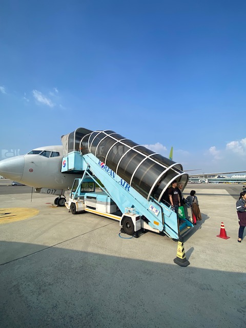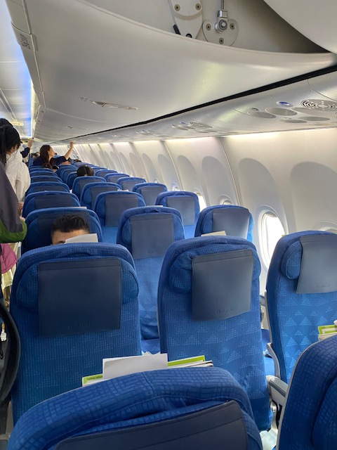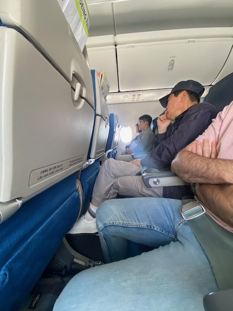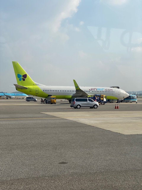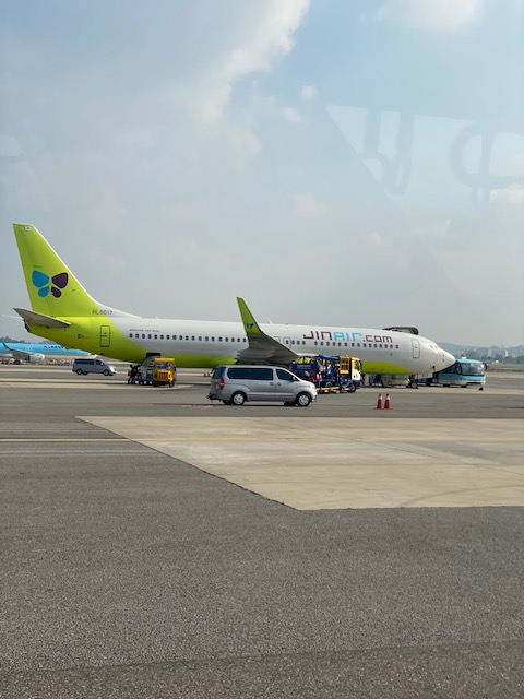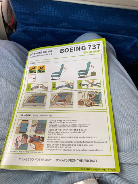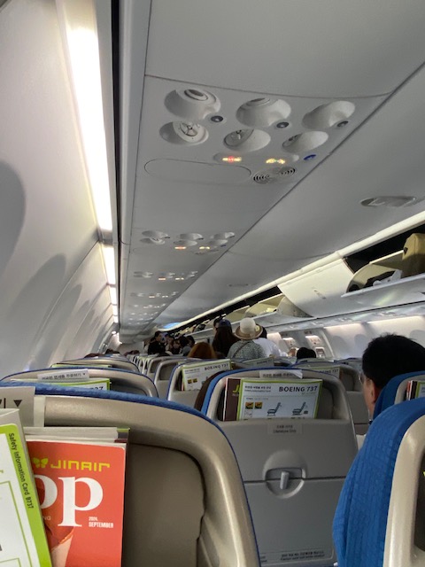 Jin Air LJ508 was again a no-thrill, no-fuss short hop. The plane, HL801, is some nine years old. So the cabin is more contemporary and what you expect for a plane configured for short-haul flights.