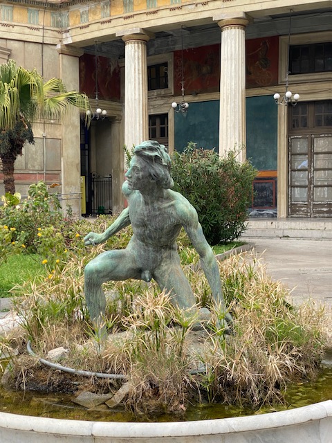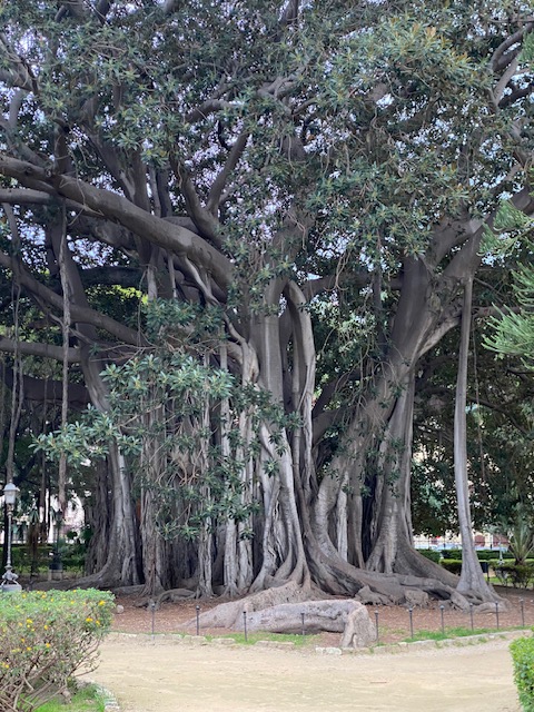 The Piazza Marina is home to a Moreton Bay fig tree with a girth exceeding 30 metres and a height of 32 metres, likely the thickest tree in Europe. On Via Roma, the Palazzo delle Poste, an official Italian government building from the Mussolini era, is notable for its stripped classicist architectural style. It features a Futurist mural cycle by Benedetta Cappa titled ‘Sintesi delle Comunicazioni’.