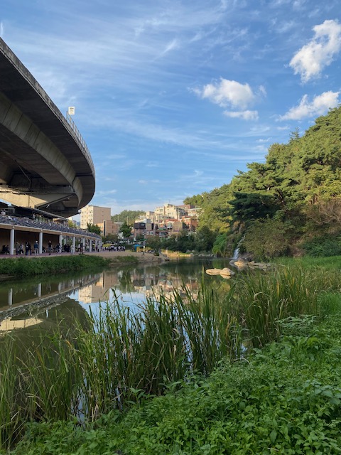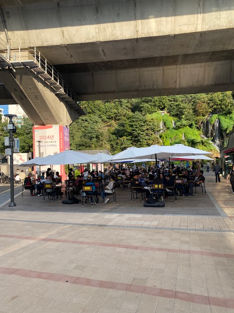On Instagram we had seen a reel showing Café Pokpo, an “oasis of calm” in Seoul. The café offers views on Seodaemun Hongje Waterfall or Hongjecheon Waterfall (홍제천인공폭포). But it was all but calm at Pokpo. It was very crowded.