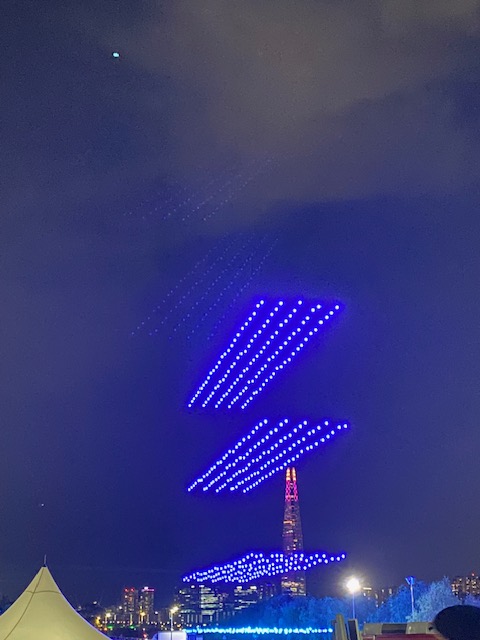 We were at Ttukseom for the Seoul Hangang River Light Drone Light Show. The show features hundreds of synchronized drones, illuminates the sky with intricate patterns, colorful lights, and animated images.