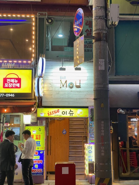 After that one drink at Eat Me on Homo Hill – remember the street name: Usadan-ro 12-gil (우사단로12길) – in Itaewon, we moved to Seoul’s other gay area: Jongno 3-ga, where we had a cocktail at Bar MoU (모우). I’ve also seen the spelling MOU in full capitals.