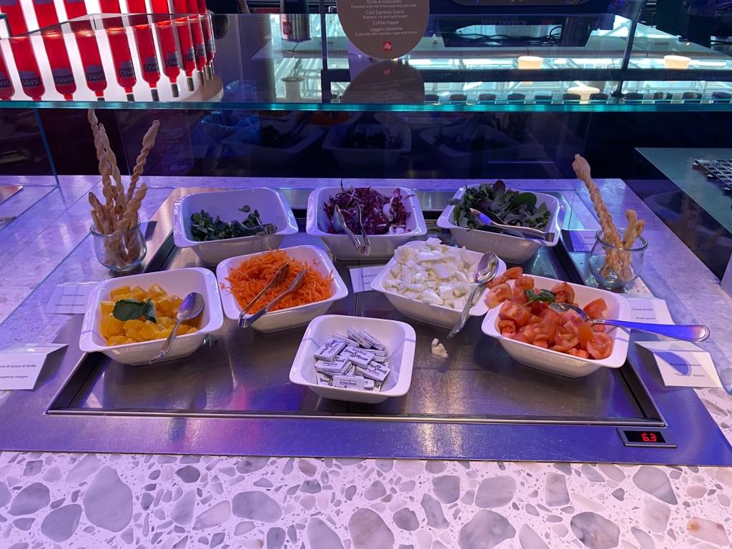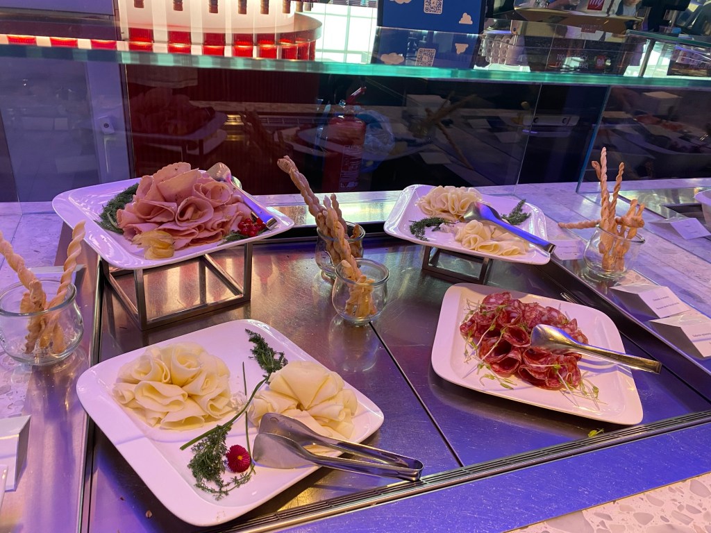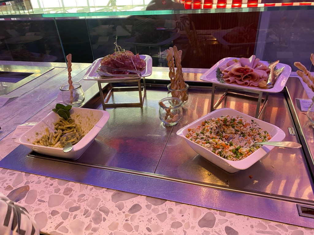 There was also a small buffet offering soup and 2 types of pasta as hot items, while offering some more salads, bread, cold pasta and charcuterie as cold options. There were some jars with cookies spread along the bar, but no real dessert options. I also missed a fridge from where you could grab your own bottles of water or non-alcoholic beverages as you needed to ask every drink at the bar.
