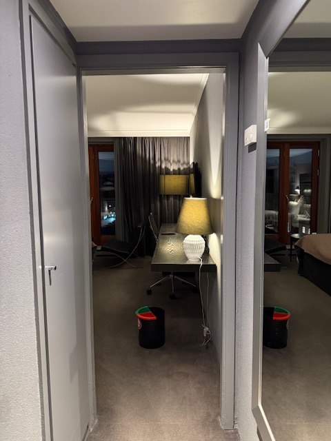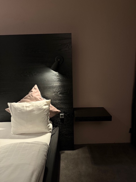 The room is spacious. The colour palette is dominated by grey and black. It works. There is a large bed. The bed linnen are presented German style, i.e. folded. There is a tv, a long desk and tea and coffee making facilities.