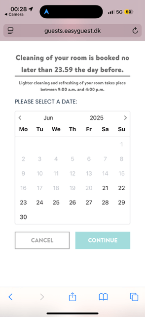 We are a Eco-labelled hotel, which means we have some requirements to live up to. We will therefore not enter your room automatically to clean it during your stay. You will receive a QR code upon check in, which you scan and book cleaning online. This is of course free of charge, but has to be booked the evening before you want your room cleaned.3. Parking
