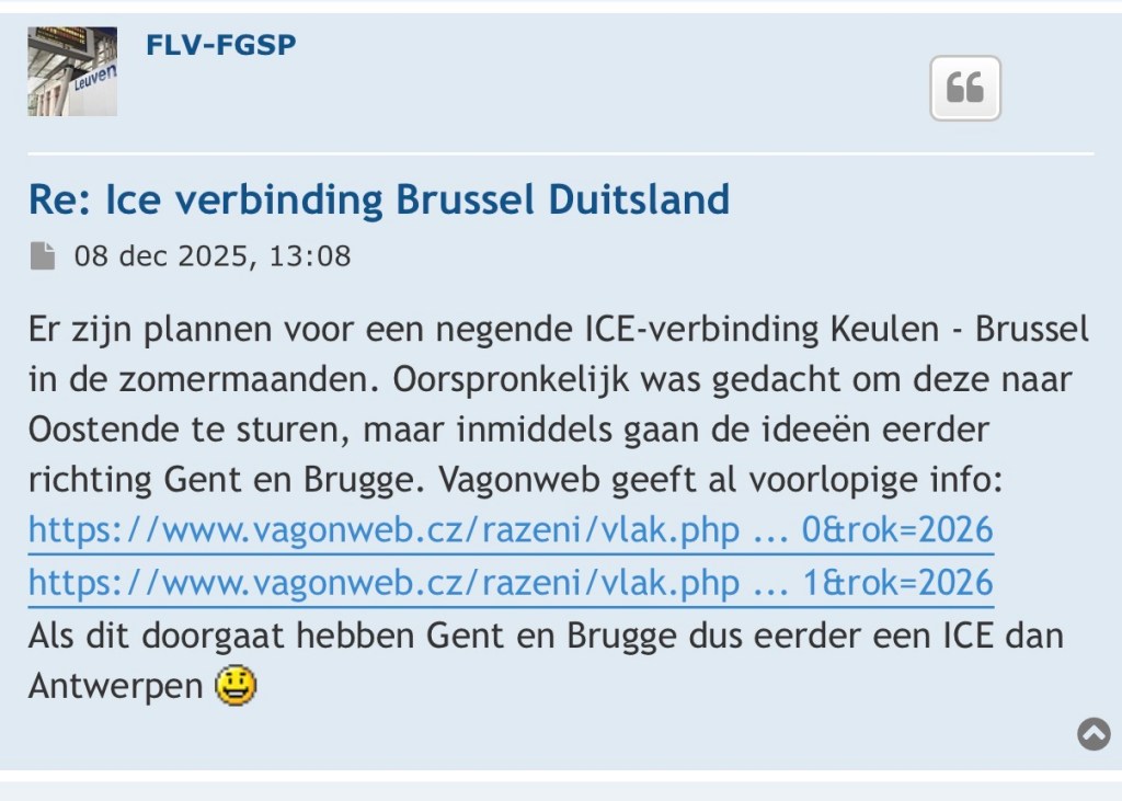 “There are plans for a ninth ICE service between Cologne and Brussels during the summer months. It was originally intended to extend this service to Ostend, but the ideas are now leaning more towards Ghent and Bruges“, Het Groot Belgisch Treinen Forum (The Big Belgian Train Forum) user FLV-FGSP says.
