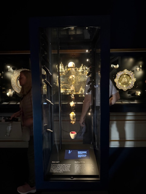 The Amalienborg Museum is located in Christian VIII’s Palace (left on the overview photo), one of the four palaces where the Royal Family resides when they are in Copenhagen. “After witnessing the historic changing of the guard by the Royal Life Guard in the palace square, step inside and take a walk through the royal family’s historic offices, marvel at the elegant Fabergé Hall — still used by the royal family on special occasions — and discover spectacular artifacts, including the lavish wine coolers in the Fabergé Chamber“, the museum website says.
