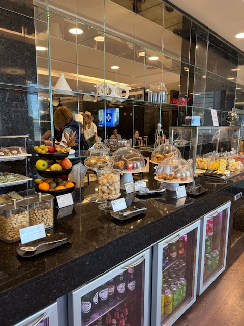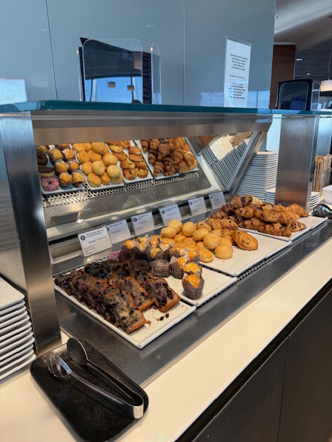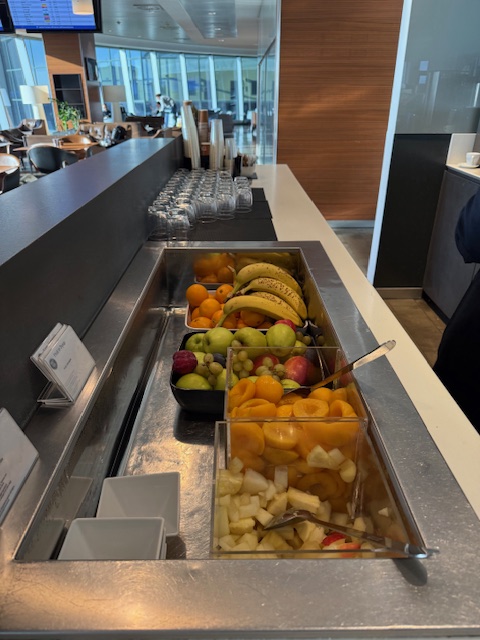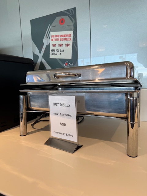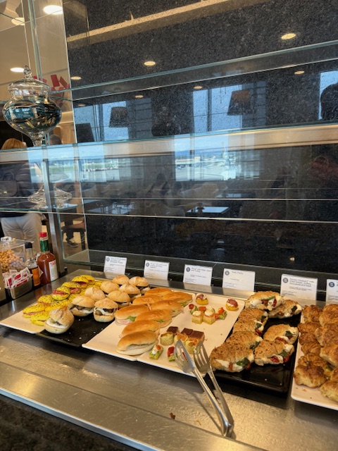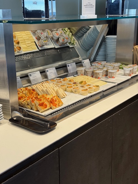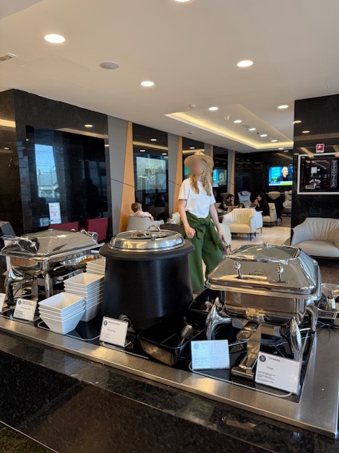 This lounge felt smaller. It also has different seating options. And this one had warm food choices!
